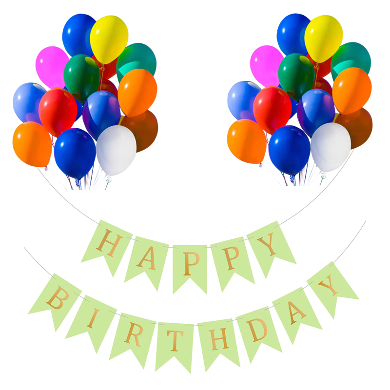 Bucurati-va de o pregatire usoara si rapida a decorului pentru petrecere cu acest set de baloane si banner Happy Birthday.